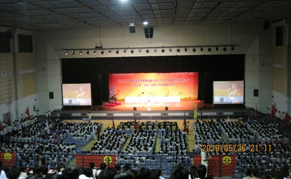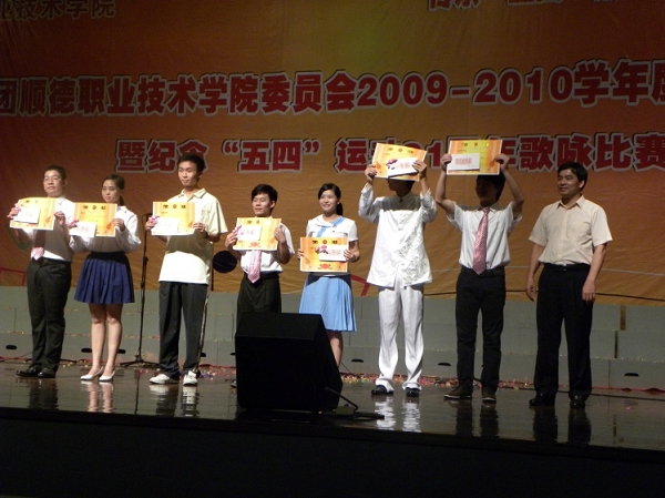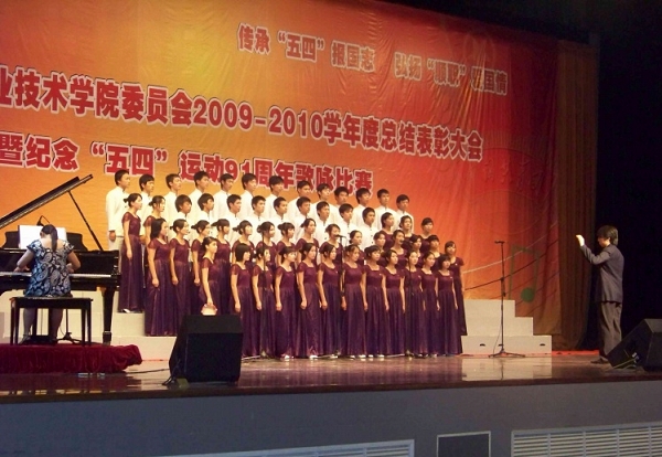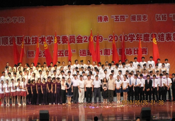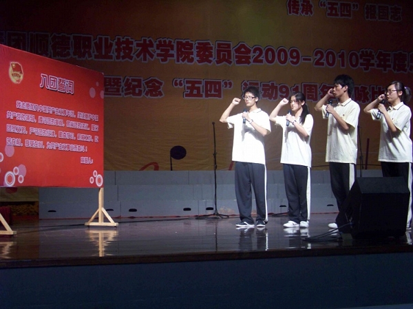为了更好地弘扬“爱国、进步、民主、科学”的“五四”精神,5月26日晚,校团委在梁銶琚堂举办了以“传承‘五四’报国志,弘扬‘顺职’爱国情”为主题的共青团顺德职业技术学院委员会2009-2010学年度总结表彰大会暨纪念“五四”运动91周年歌咏比赛。团顺德区委书记柯宇威、学院纪委书记谭谦章、学生处处长、团委书记陈曦以及各系(二级学院)师生近3000人参加了活动。比赛邀请顺德交响乐团团长尹辉、顺德合唱团副团长郭新林、大良音乐家协会会长肖永刚、顺德音乐协会理事周前、全国歌手大赛获奖者陈赛君、中国合唱协会会员康华等5位老师担任评委。