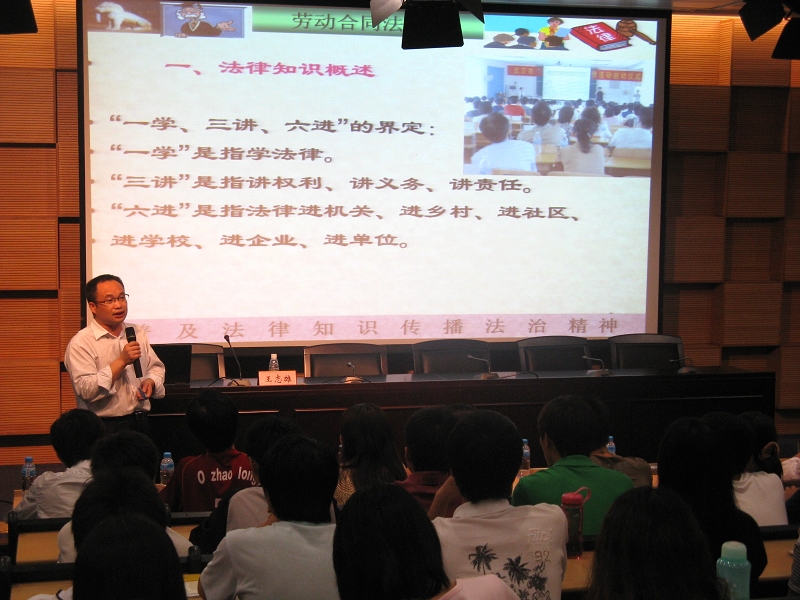 5月11日19:30,文化素质大讲堂之成人•成才•成功系列讲座第二讲《大学生就业、创业与法律知识储备——解读劳动合同法》在第五学术报告厅举行,我院思政部副教授、律师、人力资源管理经济师、顺德区“五五”普法高级讲师团成员王志雄老师担任本次讲座的主讲。同学们热情高涨,报告厅内全场爆满,座无虚席,个别同学两个人挤着坐一张椅子,部分同学在教室后坚持站着听完讲座。