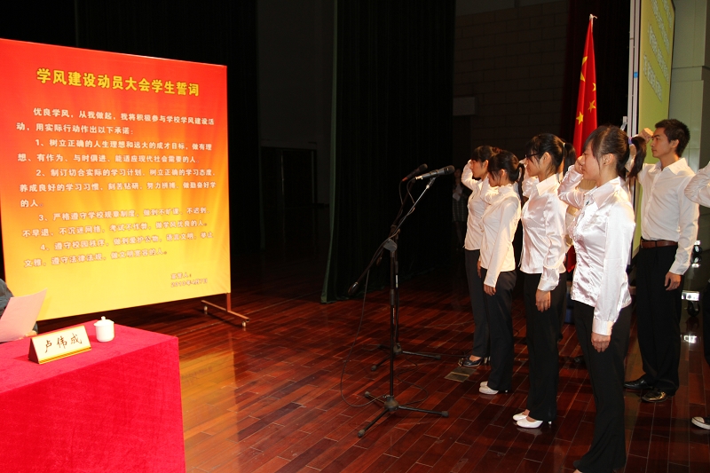 会议结束时, 2000多位同学代表全院9600多名学生集体举手宣誓《优良学风,从我做起》,共同承诺用实际行动积极参与到学风建设活动中去。