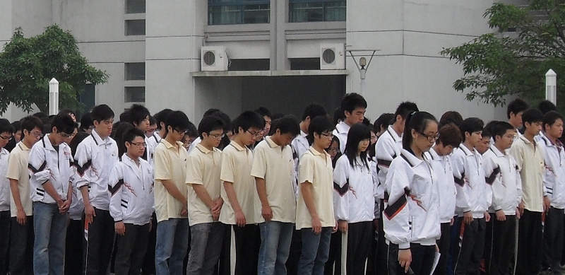 这一刻举校同泣,我们用全民族的眼泪,悼念这次地震灾害中的罹难者以及为救灾而献身的牺牲者,抚慰幸存者受创的心灵,更表达了我们与祖国同命运共呼吸的坚强信念。低头默哀那一刻,我们的心和全国人民一起跳动,我们万众一心,我们众志成城!