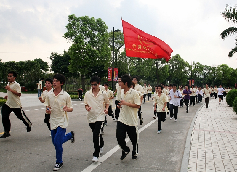 学校体委主任、纪委谭谦章书记为开幕式致辞,他对taptap去年开展体育活动的情况和取得的成绩进行了回顾,并对今年的阳光体育活动提出希望和要求。谭谦章主任要求各部门、各学生组织高度重视,密切配合,以阳光体育活动为契机,结合本系(院)实际情况,通过多种形式、大力宣传阳光体育运动,广泛传播科学锻炼理念,选定一个参与面广、深受学生喜爱的体育项目,打造本系(院)的特色体育,以点带面,形成阳光体育,全员参与、人人受益的运动氛围,推动校园体育活动的繁荣和发展。在罗勇武副院长鸣枪中长跑活动开始。2000名师生代表由梁銶锯堂门前出发,环湖经过智慧门到图书馆,最后回到礼堂门前,大家满怀激情,热情高涨,运动精神传播到了顺职的每个角落。
