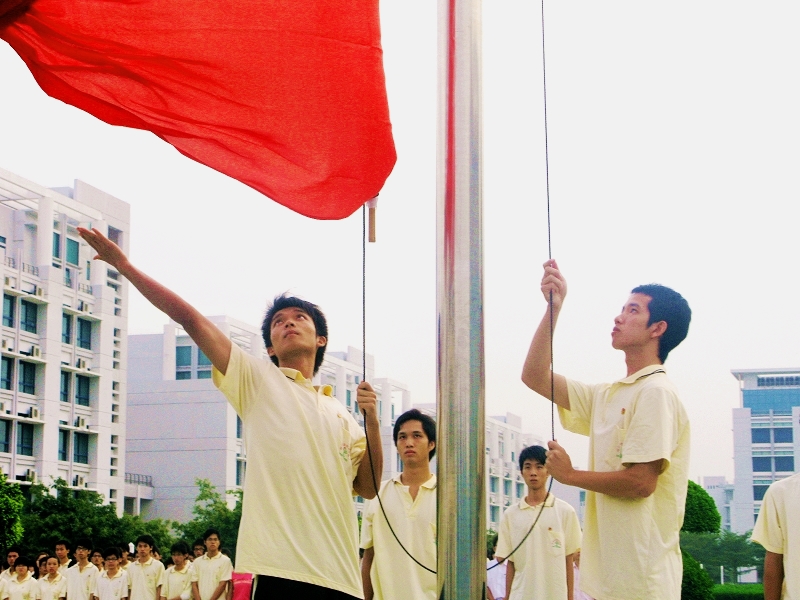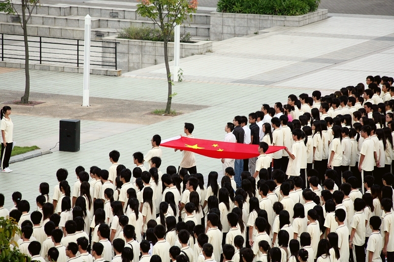 7点整,学生管乐队奏响了庄严的中华人民共和国国歌,参加升旗仪式的全体师生齐声高唱,伴随着雄壮的国歌,升旗手将国旗缓缓送到空中,鲜红色的国旗在空中迎风飘扬,所有人对国旗致注目礼。