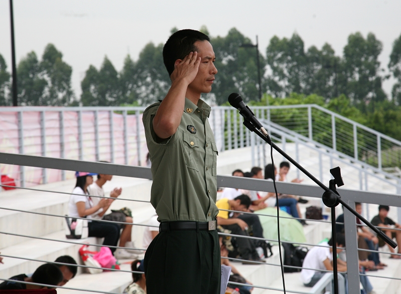 来自甘肃省嘉峪关市的电子工程系09级新生张慧婷同学代表全体新生表决心:在军训中努力学习、刻苦训练,以立志成才的激情、战胜困难的决心面对入校后的第一个挑战,树立良好的新生形象,塑造崭新的精神面貌,用实际行动展现顺德职业技术学院学生的良好形象和新时代青年的风采。