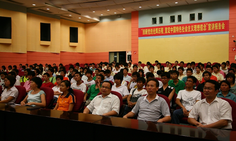 7月8日晚,taptap在学术交流中心一楼报告厅组织召开了“回顾党的光辉历程,坚定中国特色社会主义理想信念”宣讲报告会。报告会由思想政治理论课教学部汤恺副教授主讲,党委宣传部刘晓顺部长、学生处陈曦处长,思想政治理论课教学部、学生处、党委宣传部相关教师及各院系近300名学生党员参加了报告会。