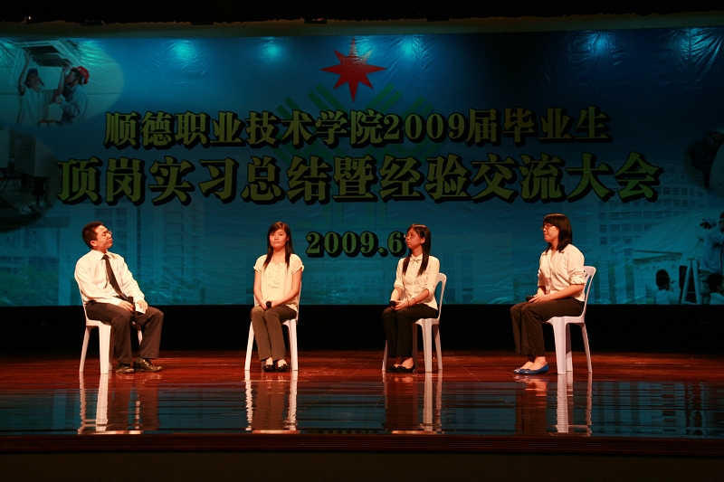 学院九个系(院)的学生代表以各种形式向师弟师妹们展示出他们的实习经历和收获:经管学院和电子系学生通过访谈对话将实习的酸甜苦辣娓娓道来;艺术设计系和机电系学生以视频配合解说将在企业中收获的点滴一一倾诉;人文教育系、外语系和计算机系学生以诚挚的语言将自己的实习体会与大家分享;医学系和酒店系极富创意,将实习生活的一幕幕汇编成小品,让大家在实境中品味他们的进步与成长!会上,佛山市亚太家具制造有限公司总裁梁宇鹏先生作为企业代表发言,他对我院学生在实习过程中的优异表现进行了肯定,介绍了企业对实习生进行管理和指导的成功经验。酒店系副主任陈顺和电子系老师林太光先后与大家分享了他们的工作方法及其宝贵经验。介绍经验的学生、老师和企业嘉宾畅所欲言,无私奉献了他们所收获的经验和体会,为以后顶岗实习工作的开展提供了很好的借鉴和启示。