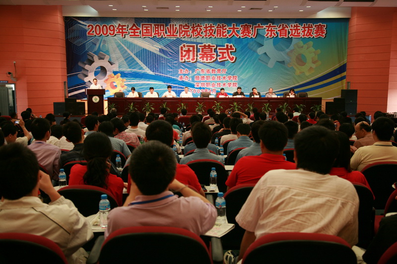 27日上午10点,2009年全国职业院校技能大赛广东省选拔赛闭幕式暨颁奖仪式在我院学术报告厅隆重举行。广东省教育厅副厅长李小鲁、广东省教育厅高教处副处长吴念香、广东省生产力促进中心副主任黄瑞健和姜慧、广东省高校数控专业教学指导委员会主任委员宋小春、顺德区科技局副局长曾广基、我院院长陈智、副院长陈粟宋、深圳职业技术学院副院长陈秋明等领导和专家出席了闭幕式,吴念香副处长负责主持闭幕式。出席领导、嘉宾、35所参赛院校代表和参赛选手等300多人共聚一堂分享成功的喜悦。
