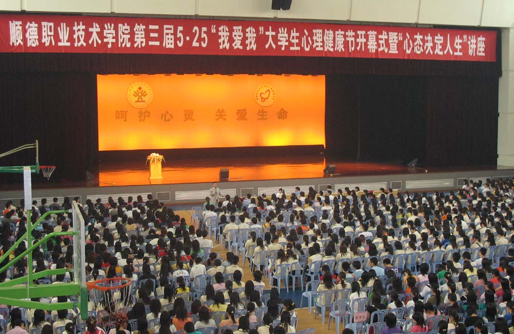 为加强和改进大学生思想政治教育,在广大同学中广泛开展心理健康知识的宣传和教育,5月24日,主题为“呵护心灵·关爱生命”的大学生第三届5·25(我爱我)心理健康节开幕式在梁銶琚堂举行,学生处副处长甘慕仪、周发新,各系负责心理辅导工作的辅导员、顺德区心声热线的嘉宾们以及2000多名学生出席了本次活动。