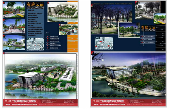 本次毕业设计作品展得到了包括沈阳建筑大学、上海交通大学、同济大学、天津大学、哈尔滨工业大学、南京林业大学、华中农业大学、中央美术学院、中国美术学院、顺德职业技术学院等全国45所农林、建筑、规划及艺术类高校的大力支持。作品设计范围涉及公园、广场、住区、道路、新校区、商业街、滨水区、度假区、风景区、建筑单体及等不同类型项目。所以希望能通过农林、建筑、规划及艺术类等院校的首次同台交流和展示,来一起推动景观设计专业的发展,从而提高景观设计行业的整体水平,构建可持续发展的和谐社会。在45所学校中,顺德职业技术学院是参赛的唯一的高职类学校,并且顺职院的作品获得了一名二等奖,三名入围奖,并且全部参加网络展的好成绩,设计作品理念新颖独到,设计思路清晰,文化韵味丰富,注重生态。其中二等奖的作品为由江芳老师和郑燕宁老师指导的叶春涛等同学的设计作品《有底之思——顺德职业技术学院校园景观规划设计》;入围奖的作品为由郑燕宁、江芳老师指导的《延续地域文化——广东省佛山顺德区顺德职业技术学院校园景观规划设计》、由郑燕宁、江芳、李冬妹、卢伟成老师指导的《安静 感受纯粹---广东省佛山顺德区顺德职业技术学院校园景观规划设计 》,这次的毕业设计大奖的成绩充分地肯定了我们园林专业在专业建设和人才培养模式以及教改景观“WORKSHOP”上的成绩。