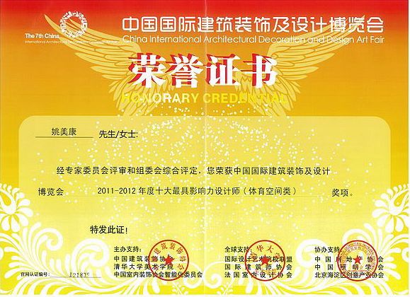 第七届中国国际建筑装饰及设计艺术博览会于11月7日至9日在北京中国农业展览馆隆重举行,taptap姚美康教授荣获“2011-2012年度中国十大最具影响力设计师”称号,其主持设计的2014年浙江省运动会主要场馆设计应邀参加了展览。此次博览会由中华人民共和国住房和城乡建设部、中国国际贸易促进委员会主管并批准,中国建筑装饰协会、中国房地产业协会、清华大学美术学院、中国贸促会建设行业分会、香港室内设计协会、台湾设计师协会、法国室内设计协会、瑞士建筑师协会等联合主办,是一次与国内外顶级设计机构同台竞技的盛会。