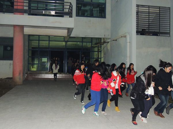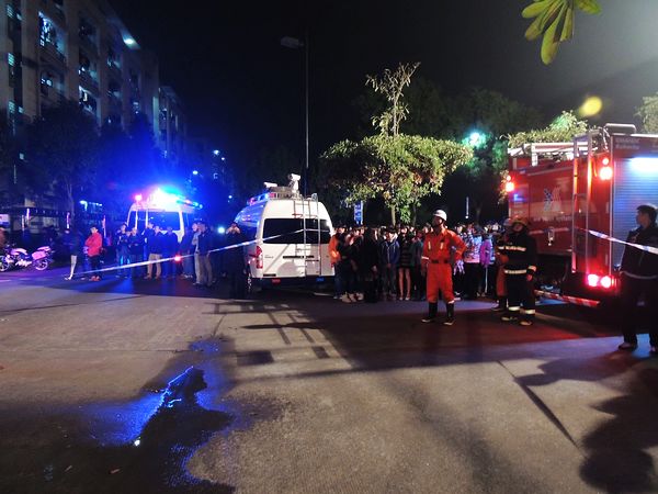 当晚7时正,随着演练总指挥一声令下,演练正式拉开帷幕。模拟起火点603室顷刻浓烟滚滚,警铃大作,学生随即进行了报警。疏散组立即启动应急疏散程序,指挥、引导参演学生紧急疏散到安全地带。与此同时,消防大队接到报警后,消防直臂云梯车、多功能抢险救援车、泡沫灭火车和现代水罐车、救护车、现场指挥车等近10辆专用车辆先后进入起火现场,在指挥员的统一指挥下,立即展开了战斗队形。救援组携带测温仪、热像仪、生命探测仪进行火场侦查;灭火组数辆消防车射出数条水龙对起火部位定点扑救,直臂云梯车从7楼成功的救下被困3名学生,救护车对受伤师生进行了急救。整个演习过程场面宏大、气氛逼真、井然有序,达到了预期的效果。演练过程中,顺德电视台、珠江商报等多家社会媒体对参演师生进行了全程跟进和采访。