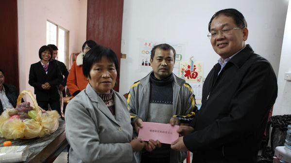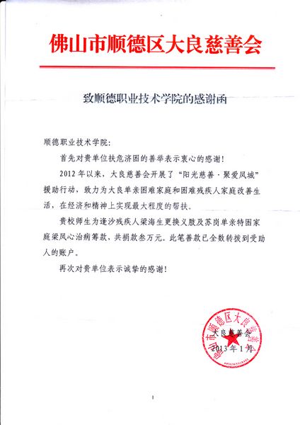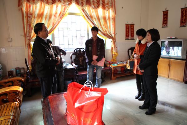 2013年1月14日下午,学校党委副书记何锐连代表学校,与党办校办负责人、党委宣传部负责人以及顺德大良慈善会负责人一起,到苏岗、逢沙社区慰问单亲特困家庭及困难残疾人,并将善款送至受助人手中。受助人及其家庭十分感动,感谢顺德职业技术学院教职工奉献的爱心,并请何锐连副书记转达他们对学校教职工的深情谢意。此善举也得到了顺德区大良慈善会的表彰和肯定。