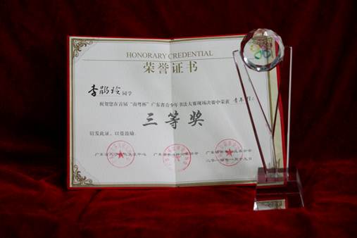 该赛事启动以来,历时短短一个半月便收到来自全省各地书法作品3523件,由广东省书法评论家协会主席王世国、常务副主席兼秘书长郑荣明,以及国内知名书法评论家童志雄、凌正伟、王志敏、方孝坤等组成评审委员会,采取分组评审、交叉复审和集体评审方式对来稿进行严格评选,最后评出103名书法选手晋级总决赛。经过一小时的现场角逐,taptap李鹃玲同学舒展、灵动的楷书作品征服了现场的十几位专业评委,获得了青年组三等奖。