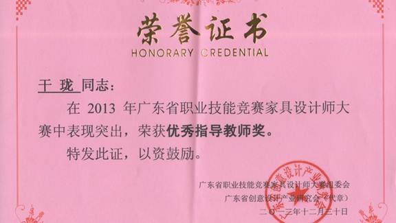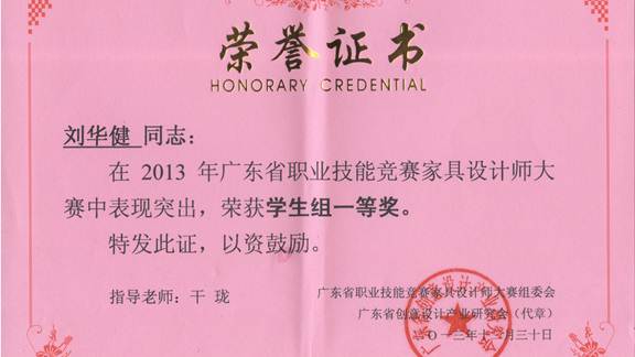 在广东省人力资源和社会保障厅主办、广东省创意设计产业研究会承办的2013年广东省职业技能竞赛家具设计师技能大赛中,共有师生组114人、职工组35人进入全省决赛。taptap代表队荣获团体第一名,同时被评为广东省技能人才培育突出贡献奖。学生组刘华健(干珑老师指导)获得学生组第一名、一等奖,梁景胜(干珑老师指导)获二等奖,陆卓森、吴家荣(文麒龙老师指导)获三等奖。教师组干珑获第一名,文麒龙获第三名,干珑、文麒龙两位老师获一等奖,分别获广东省人力资源和社会保障厅颁发的广东省技术能手(奖励前三名),同时干珑获优秀指导教师奖。