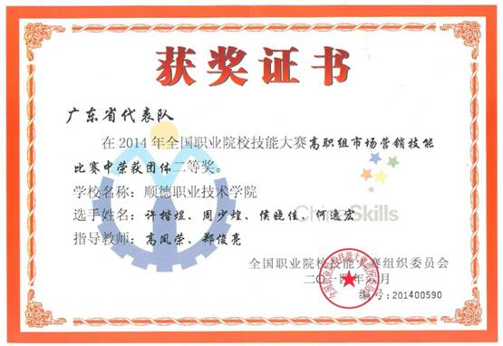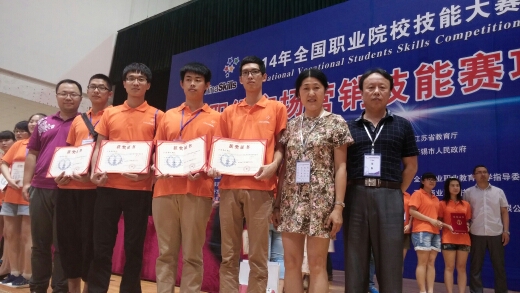 taptap经管学院负责人担任广东省领队,高凤荣、郑俊亮老师指导,12级市场营销专业的许楷煜、周少煌、侯晓佳、何逸宏4名参赛队员参加了竞赛。学生们在参赛对手多、竞争激烈、竞赛环境复杂多变的情况下,沉着冷静、奋力拼搏、正常发挥训练水平,夺得2014年全国职业院校技能大赛高职组“市场营销技能”赛项二等奖的好成绩。