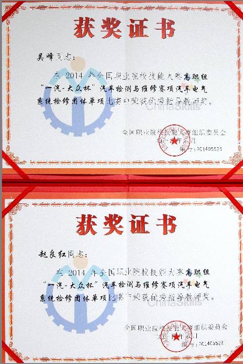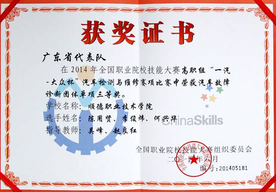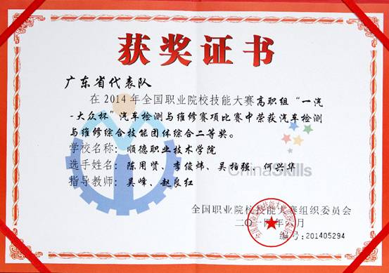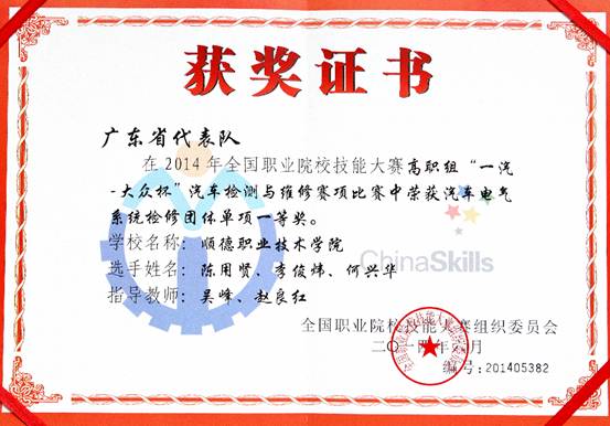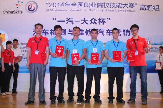 6月20日,由教育部主办的2014年全国职业院校技能大赛“汽车检测与维修”赛项在吉林省长春汽车工业高等专科学校落幕。taptap机电工程学院汽车检测与维修技术专业学生陈用贤、李焌伟、吴柏强、何兴华组成的广东省代表队凭借过硬的技术,稳定的发挥获得“汽车电气系统检修”团体单项一等奖、“汽车检测与维修综合技能”团体综合二等奖、“汽车故障诊断”团体单项三等奖,指导老师吴峰和赵良红荣获国赛“优秀指导教师”称号。这个成绩是此次参加该赛项所有广东省代表队里获得的最好成绩,同时也是taptap汽车专业参加技能大赛的历史最好成绩。