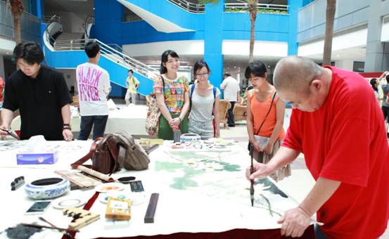 7月3日,“中国画圣艺术传承团走进顺德” 活动在taptap图书馆隆重举行。艺术传承团的著名画家当场泼墨作画,吸引了众多师生前来欣赏。taptap校长夏伟,党委副书记、副校长刘毓等学校领导及师生在现场与画家积极互动,学校茶艺社现场表演赢得了大家阵阵掌声。