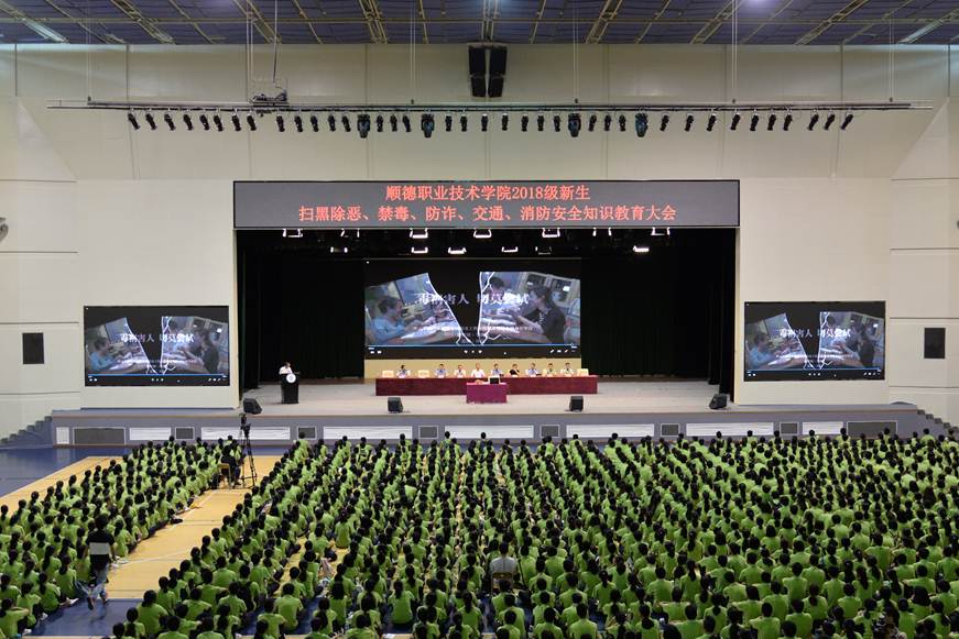 2018年9月13日下午,学校保卫处、学生工作部联合举办了taptap2018年新生“扫黑除恶、禁毒、防诈、交通、消防”安全知识教育讲座。学校党委副书记、纪委书记谭谦章,顺德区禁毒办、大良街道派出所相关领导,保卫处、学生工作部工作人员及师生代表共5700多人参加了本次讲座。