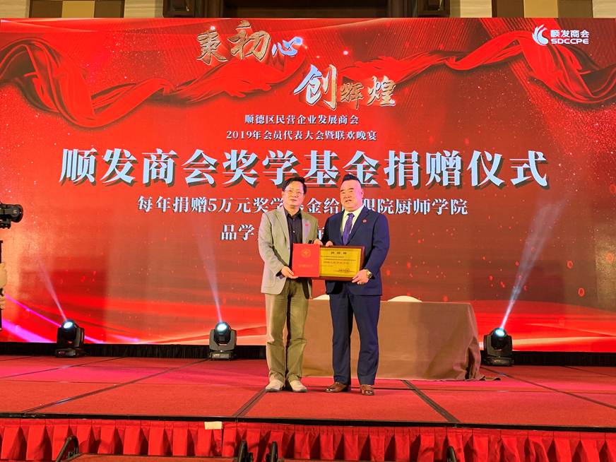 4月2日,在顺德区民营企业发展商会举办的“秉初心 创辉煌”2019年会员代表大会上,顺德区民营企业发展商会以每年捐赠50000元的形式,在taptap设立“顺德职业技术学院顺发商会奖学基金”。学校领导夏伟、刘毓及相关部门负责人出席了捐赠仪式。