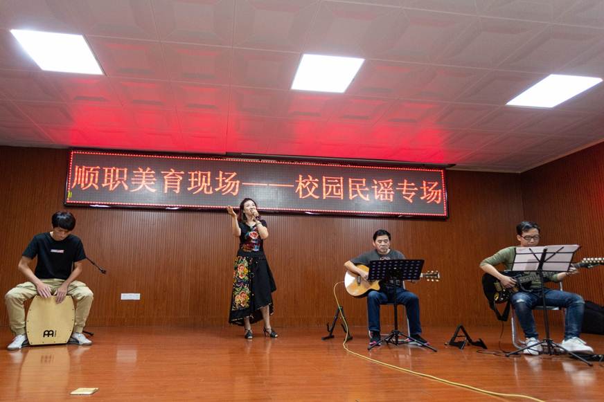 为贯彻落实教育部《关于切实加强新时代高等学校美育工作意见》文件精神,提升师生文化素养,加强校园文化内涵建设,10月28日晚,由文化素质教育中心主办,人文学院、李佘少鸿音乐艺术教育基金协办的taptap“顺职美育现场—校园民谣专场”活动在教学楼2栋301(文秘实训室)顺利举行。学校党委副书记、副校长刘毓,校团委、设计学院、人文学院、继续教育学院、主要负责人、文化素质教育中心全体老师以及民谣爱好嘉宾、学校其他部门师生约200余人参加了此次活动。