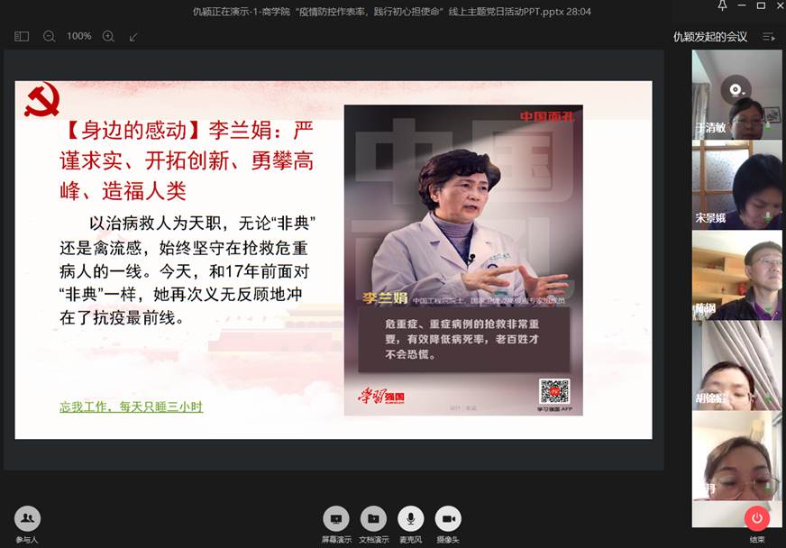 本次线上主题党日活动议程有三:一是重温入党誓词,时刻提醒党员同志们做到不忘践行初心、勇于当担使命;二是进一步了解新冠状病毒及目前的疫情防控形势,继续做好个人防护,服从学校、政府部门做好健康登记、行踪汇报等一系列信息填报工作,同时还学习了在最关键的疫情防控阶段逆向而行、无私奉献的钟南山院士、李兰娟院士先进事迹材料,还在线了解分享本教研室卢丽琴老师以及其家人赴湖北支持疫情防控的先进事迹。支部党员同志们感同身受,一致做了“我是党员我带头”的郑重承诺!三是回顾疫情防控期间以来,党员们都有做出了表率,均积极捐款,以实际行动关注、支持湖北武汉疫情。同时也做到了立足本职,率先做好停课不停学一系列工作,开学前全体党员就与学生们沟通,并积极搭建或寻找与课程相关的优质教学资源,财经党支部最早做好了网课授课计划,全部课程如期开展网络教学,并收到了良好的授课效果!