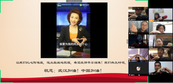晚上8时,商学院党政办公室党支部全体党员,准时进入腾讯会议,通过视频参加本次线上主题党日活动。党支部书记主持了本次活动。活动主要对新型冠状病毒疫情防控的精神和代表人物的事迹进行了集中学习,并进行了经验分享。首先,在重温入党誓词后,党员同志集中观看《学习强国》平台上钟南山、李兰娟等先进人物的感人事迹,学习他们大无畏的奉献精神,进行自我鞭策,争当优秀共产党员。随后,支部优秀党员严嘉荣、陈琪同志作为先进代表,分享了疫情防控中的工作心得,他们鼓励支部党员应该“不忘初心、牢记使命”,立足本职工作,在疫情防控中作表率。接着,支部党员纷纷结合身边感动的人与事,分享疫情期间个人工作、生活感受和学习心得。最后,支部党员互相鼓励、网络传心,用手比心传递爱,送出大家真挚地祝福,并逐一宣读《“我是党员我带头”》承诺书。
