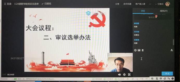 承前启后,继往开来。按照顺德职业技术学院党委的工作部署,酒店与旅游管理学院党总支于2020年3月24日下午通过网络平台召开全体党员大会,举行酒店与旅游管理学院党总支委员会换届选举工作。本次大会由酒店与旅游管理学院党总支副书记綦恩周主持,大会应到正式党员22人,因病请假1人,实到党员21人,有选举权的党员21人。
