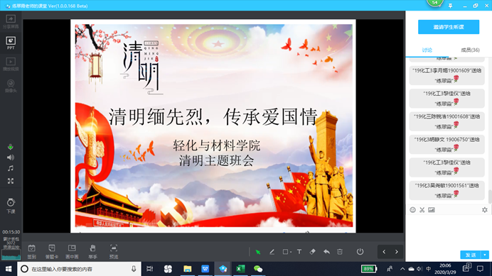 又是一年春草绿,梨花风起清明时。清明节是我们缅怀先烈、祭奠逝者、追思故人的传统节日。为倡导文明祭祀,保护绿水青山,全力确保清明期间疫情防控到位,打好打赢防疫防火“双防战”,根据省教育厅《关于开展文明祭扫专题教育的通知》和学校相关工作部署,清明节前,轻化与材料学院各班级借助网络平台陆续召开以《清明缅先烈,传承爱国情》为主题文明祭祀班会活动。
