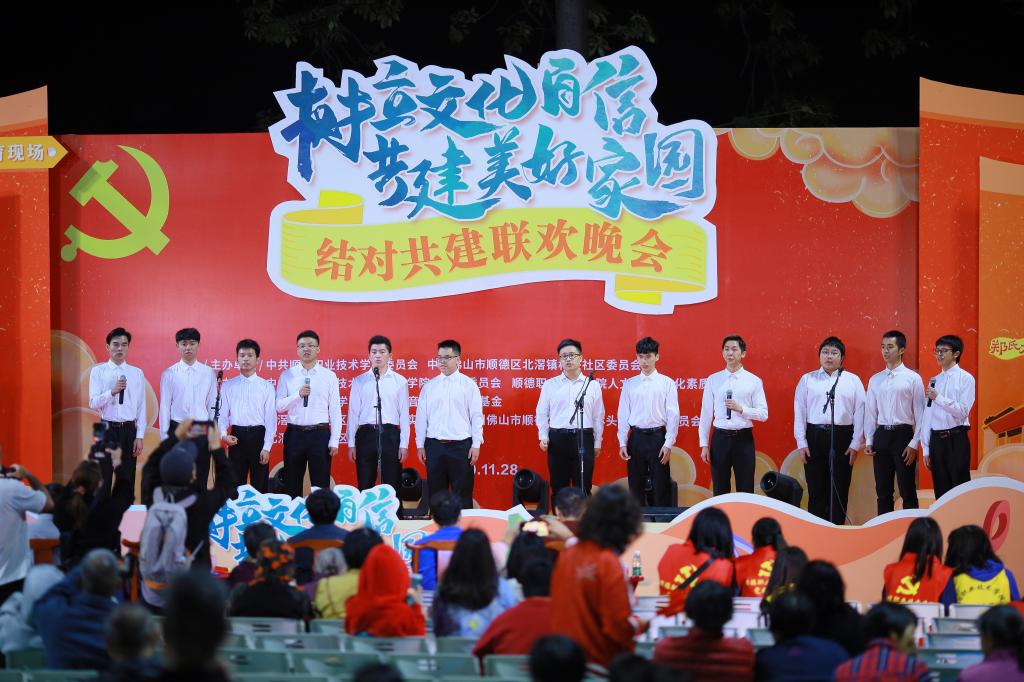 11月28日晚上,人文学院党总支与顺德区北滘镇林头社区党委联合举办了主题为“树立文化自信·共建美好家园”的美育现场结对共建联欢晚会。这场晚会在北滘镇林头社区党群活动中心举行,顺德区委宣传部副部长、区文联主席何鸿佳,学校党委委员、组织人事处处长陈文海,林头社区党委书记梁志能,第一书记何志锋,人文学院党总支副书记、院长刘晓顺,人文学院党总支书记李玉春,林头社区党委副书记梁伟锋,以及人文学院60多名师生党员、20多名学生演职人员、近400名林头社区群众参与了本次晚会。