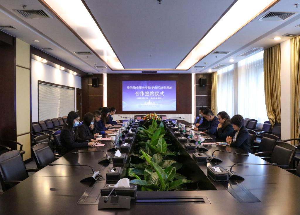 现场举行了签约仪式与揭牌仪式。双方代表共同签订了培训基地合作协议,并为美的物业服务学院进行揭牌。