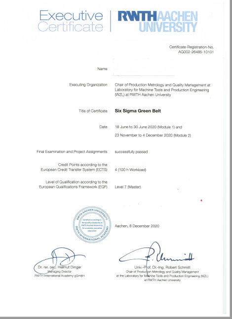 2021年3月3日,广东-亚琛工业4.0应用研究中心承办的“六西格玛绿带”认证培训班完满结束,在3B401举行了结业典礼。参加典礼的由组织人事处教师发展中心尚立云主任、德国亚琛工业大学WZL研究所梁俊杰研究员、智能制造学院相关负责人以及所有参加培训的老师。尚立云主任和梁俊杰研究员为参加培训并考试合格的教师颁发亚琛工业大学六西格玛绿带证书。