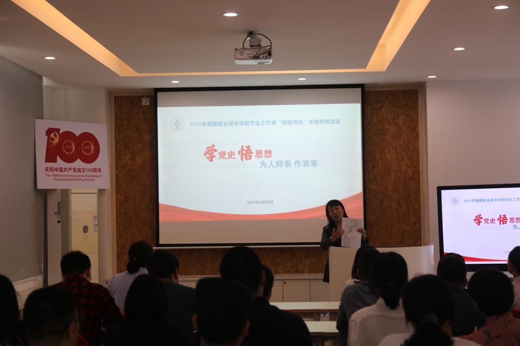 为深入贯彻党的十九大报告关于“加强师德师风建设,培养高素质教师队伍”的总体要求,落实《顺德职业技术学院师德师风专项整治工作方案》,切实将新时代高校教师职业行为“十项准则”落到学工队伍工作实际,营造风清气正的学生工作教育生态。4月30日上午,学生工作部在易班发展中心举办2021年学党史、悟思想“师德师风”专题教育活动,全体辅导员及学工部全体老师参加了活动,活动由学生工作部副部长揭育通主持。