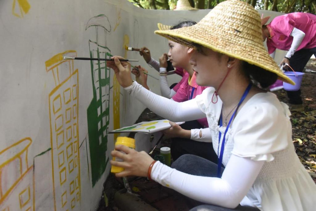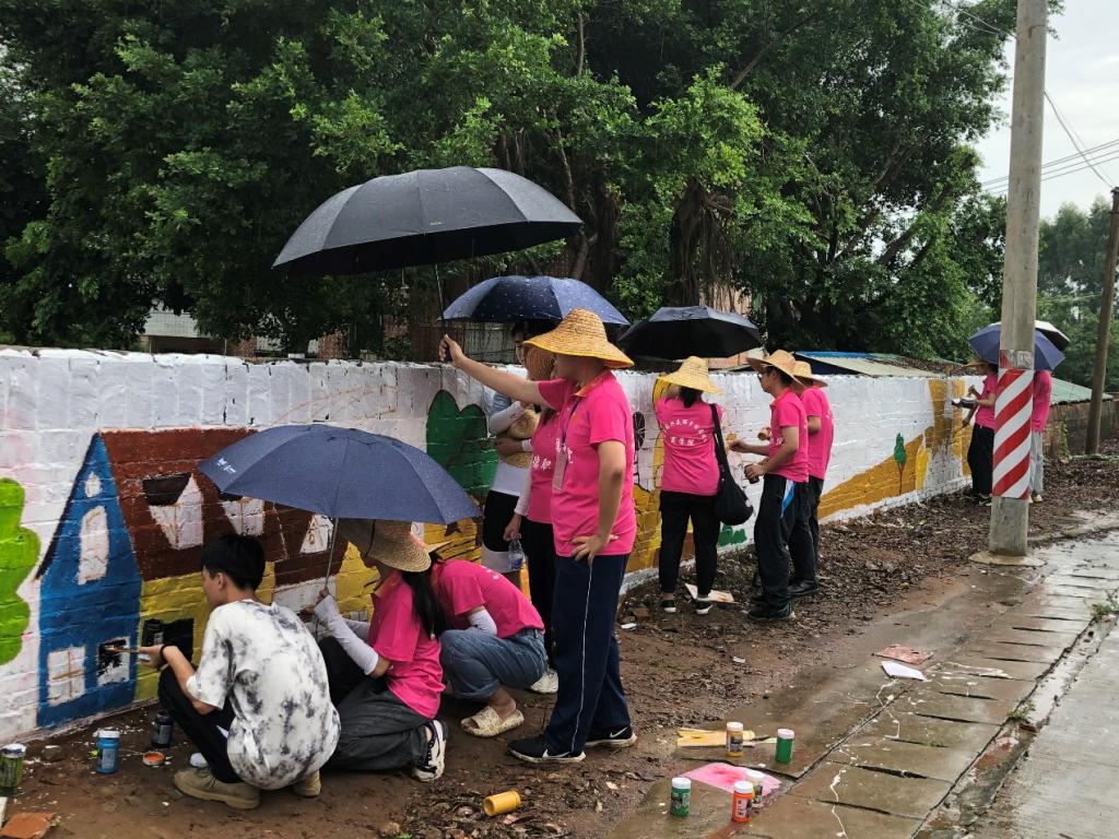 绘画过程吸引了当地村民驻足围观,也有小朋友一同参与到绘画过程中。当地政府给队员们送来雨衣,通过各种方式支持实践队的工作,给予队员们极大的鼓励。土札村村民李阿姨表示:“顺德职业技术学院‘三下乡’服务队真的很用心,进一步美化了环境。”