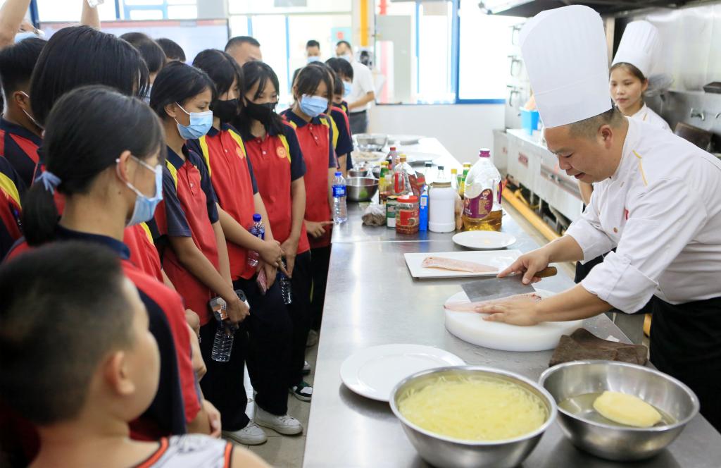 随后,同学们来到中餐实训教室,只见中国烹饪名师麦盛洪正在研发新菜品。同学们围拢起来,听麦老师讲解无骨鱼的烹饪方法,近距离观看他给鱼肉去骨。“我也想回家后把这道菜做给爸爸妈妈吃。”同学们被顺德菜的魅力深深吸引,纷纷好奇地伸出小手抚摸软滑的鱼肉,发出啧啧称赞。