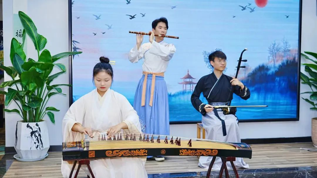 随后,民乐团的同学们演奏《兰亭序》《战马奔腾》等乐曲,带领大家了解学习中华优秀传统文化,在乐器讲解与现场互动中进一步了解民族乐器。