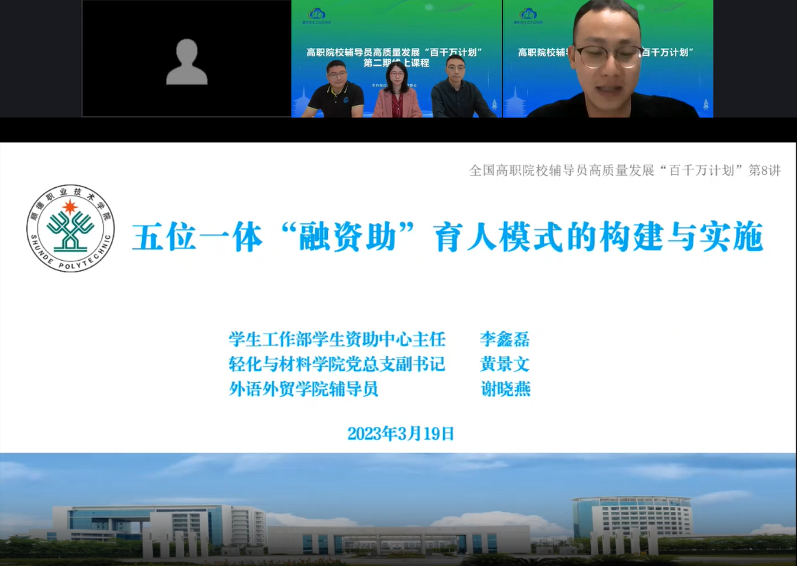 今年以来,高职院校辅导员高质量发展“百千万计划”通过线上方式开讲。3月19日,taptap学生工作部、轻化与材料学院、外语外贸学院教师作为第二期线上课程主讲团队之一,以《五位一体“融资助”育人模式的构建与实施》为题,首次向全国学生工作团队分享资助育人工作经验,展示taptap学工风采。