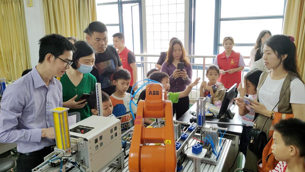活动中,智能制造学院师生担任科普志愿者,引导顺峰小学学生及家长参观广东-亚琛工业4.0应用研究中心,讲解美的集团数字化转型示范厅、数字化转型应用超市,让孩子们了解智能家居与物联网家电在生活中的运用,激发孩子们爱科学、学科学、用科学的兴趣。随后,学生和家长们参观了3D打印技术体验实训室与工业机器人技术体验实训室,智能装备与制造教研室党支部教师党员讲解实操,手把手教孩子们体验3D打印技术、操作机械手臂、运行物料传送带,培养他们的动手能力和创新思维。