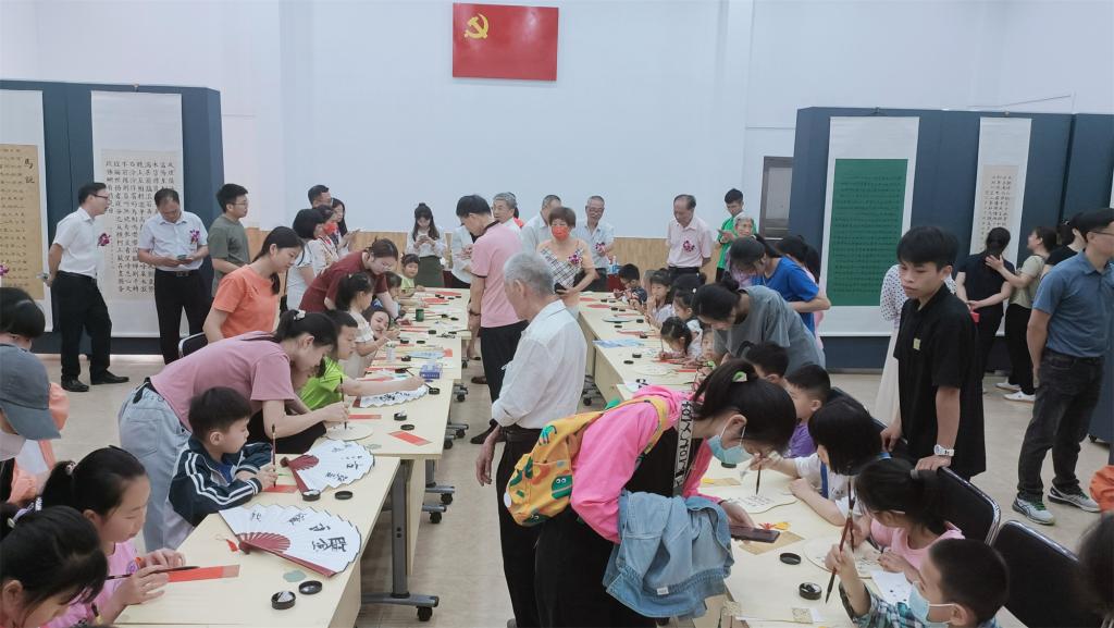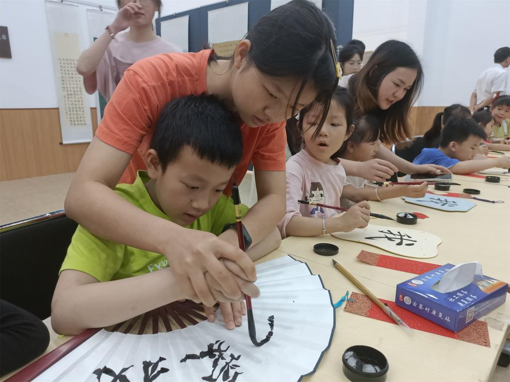 为让辖区青少年在翰墨书香中感受书法的魅力,增进对书法的了解,现场设置了教学指导环节,taptap师生指导当地少年儿童练习书法。孩子们认真听讲,一笔一划地在纸上临摹练习,在老师手把手指导下,在折扇、团扇、书签上题字。孩子们捧着自己的书法纪念品笑开了花,纷纷表示书法很有趣,希望能继续深入学习。