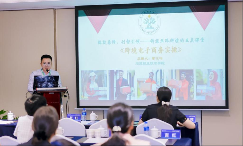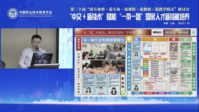 在“说课程”环节,taptap外语外贸学院教师李泳璋围绕《跨境电子商务实操》课程进行了题为《德技兼修,创智引领——铸就丝路辉煌的五真课堂》的主题分享,阐述了如何构建以“求真”为途径、以“思政”为归宿、以“创业”为主张的丝路电商“五真课堂”,以及外语外贸学院如何借助教学模式创新,培养会语言、通国家、精技术的高水平跨境电商人才。他还分享了taptap通过国际化平台构建,推动建设服务国家发展战略的高水平职业技术大学的实践经验。
