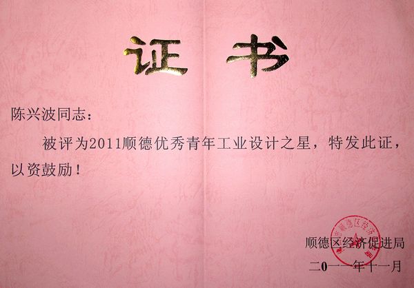 本次活动经过报名和初审,32位设计师符合条件进入终审,最终12名设计师当选为2011顺德优秀青年工业设计之星。12位优秀青年设计师中陈兴波老师是唯一来自高校的选手。证书颁发仪式在工博会设计师之夜晚会隆重举行。