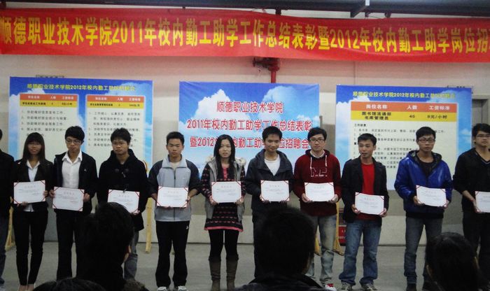 12月14日下午,顺德职业技术学院2011年校内勤工助学总结表彰暨2012年校内勤工助学岗位招聘会在梁銶琚礼堂成功召开。各用工部门指导老师和各院系前来应聘的学生共600多人参加了本次活动。