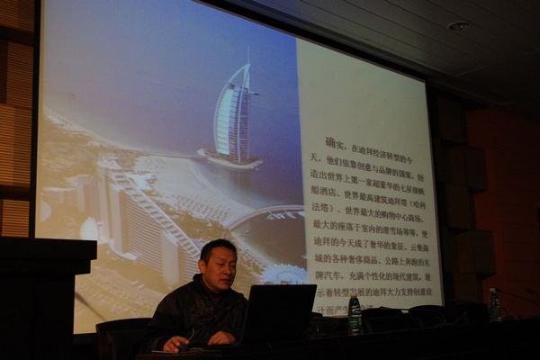 张建国副教授从迪拜这个城市“她由沙漠的一颗尘埃演变成今天的的璀璨之星”的神话导入,给大家展示迪拜的许多经典建筑。张老师告诉我们,迪拜设计汇聚全世界艺术的精髓,它不仅是设计师个性的写真,还体现了品牌设计的力量。