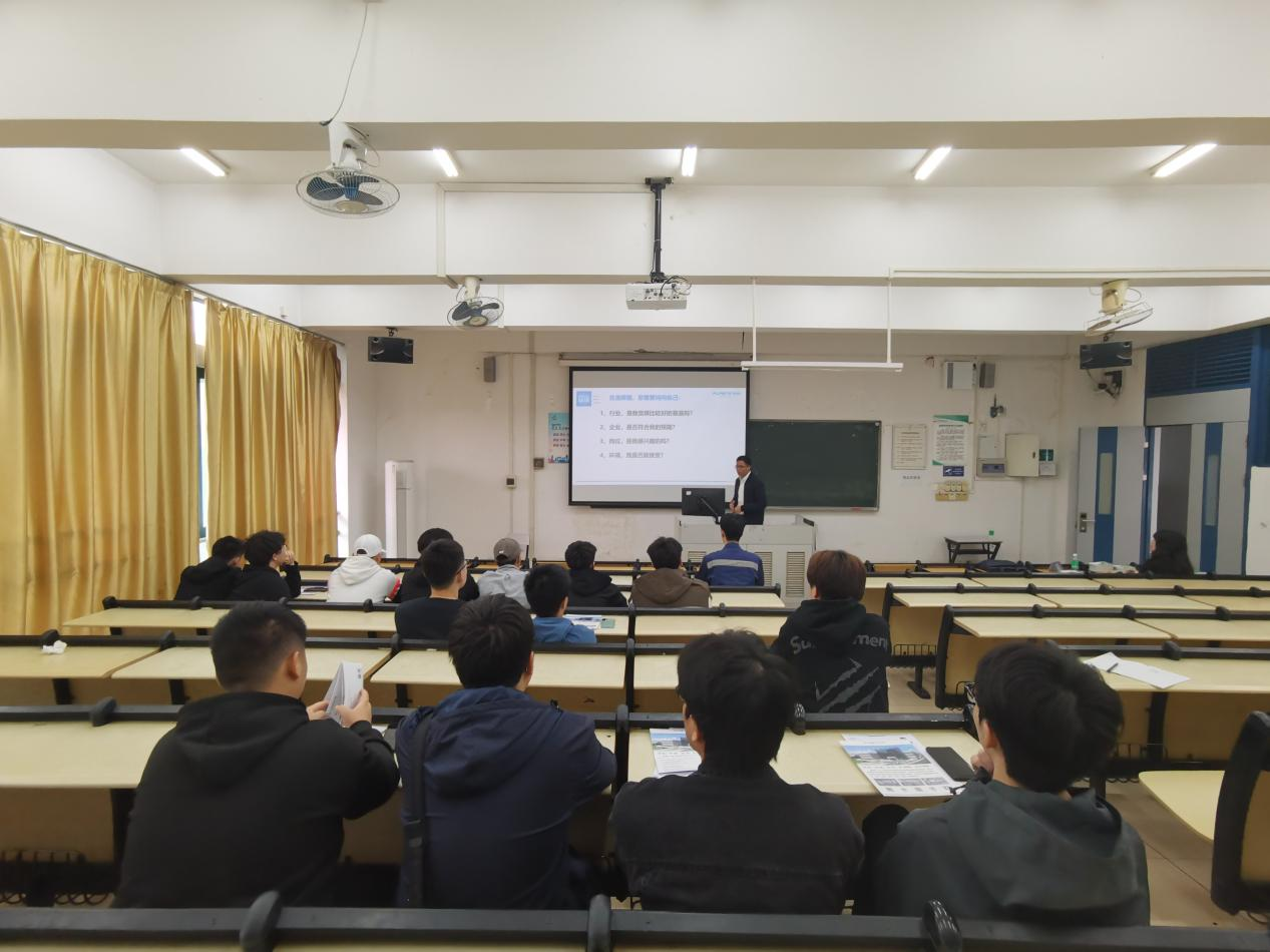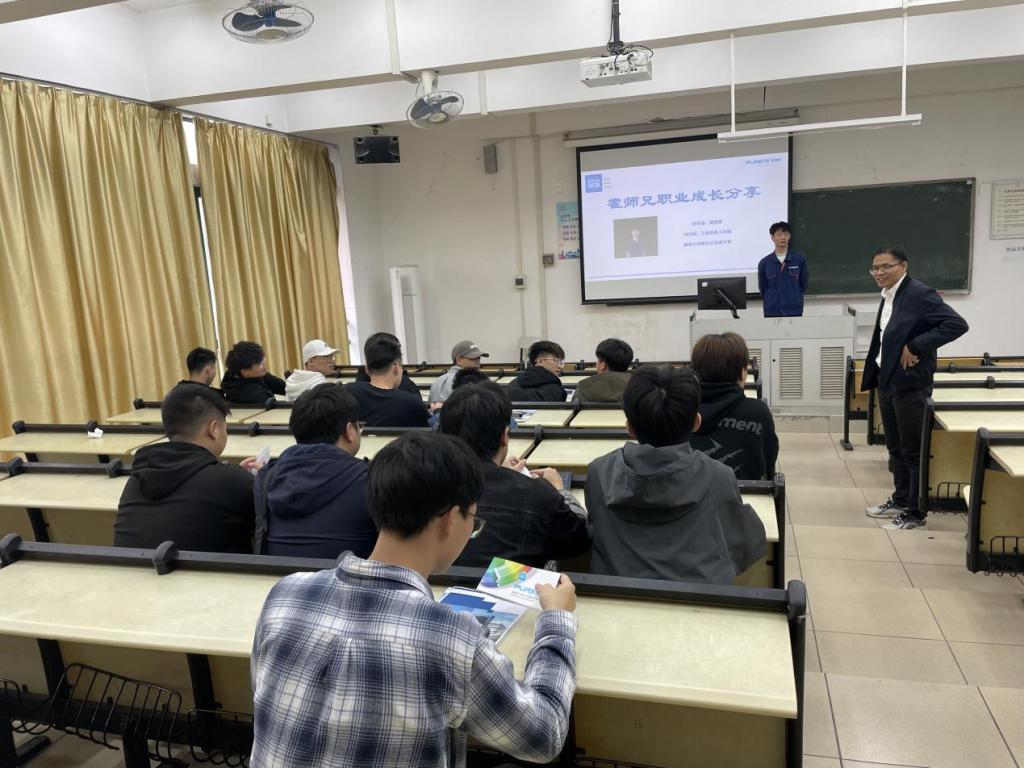 在活动现场,公司项目支持部主管、校友霍韵辉为大家分享了进入广东瀚秋智能装备股份有限公司三年来的职业成长经历,勉励师弟师妹们要入一行爱一行,深入扎实地把工作做到实处。