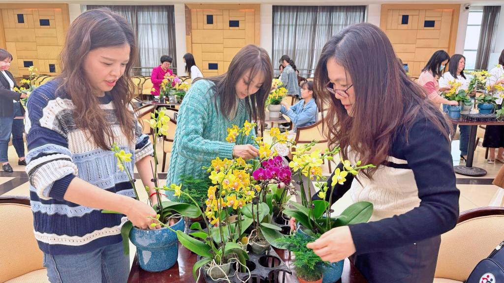 活动现场,设计学院阙彩霞老师围绕认识蝴蝶兰、蝴蝶兰养护、蝴蝶兰的组盆等方面为大家介绍蝴蝶兰相关专业知识,并现场演示组盆技巧。在阙彩霞老师的精心指导下,“女神们”个个兴趣勃勃,跃跃欲试。经过一个多小时的忙碌,一盘盘错落有致、色彩鲜艳、造型别致的花艺作品“新鲜出炉”,随后,大家争相展示成果,与作品合影留念。