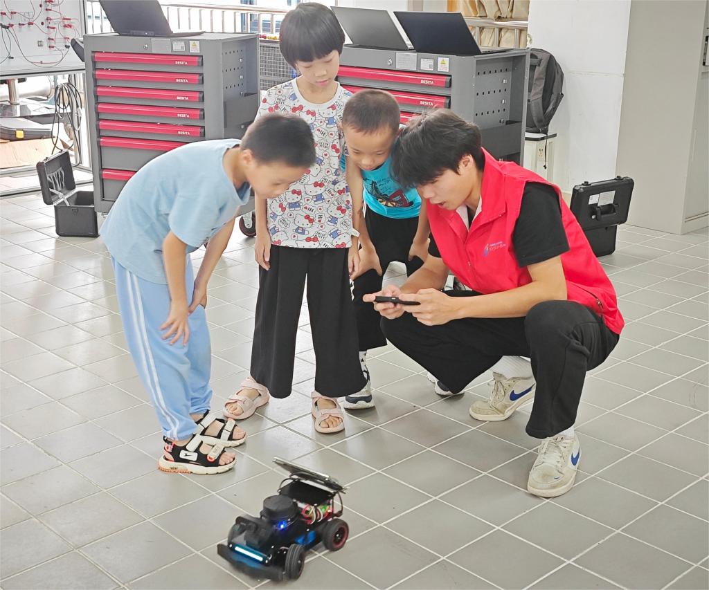 突击队成员们在学校实训楼8栋开设新能源汽车科普课堂,为小朋友们讲解新能源汽车的由来、特点、功能。小朋友们在实训室进行有趣的塔克小车游戏,观看了小车基本操作、激光雷达跟踪、SLAM建图及自动驾驶等。小朋友们见到坦克车兴奋不已、积极互动,学习控制步骤后立即上手实践。在实践过程中,大家各自发力,了解了坦克车的操作、行动轨迹和路线,收获了课堂之外的快乐。同学们还前往新能源汽车实训室,坐上无人驾驶汽车,在欢声笑语中感受科技进步的魅力;参观制冷实训室和光伏小屋,探寻其中隐藏的“黑科技”,学习绿色循环发展理念,提升意识。