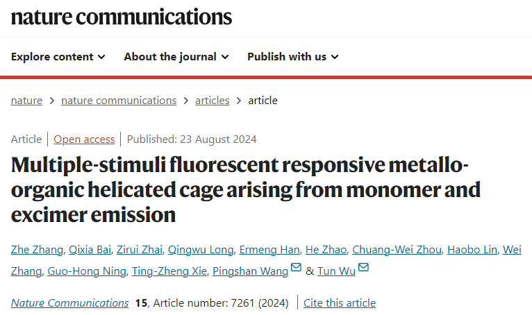 近日,轻化与材料学院龙庆武博士与广州大学合作的研究成果发表在极具影响力的综合性期刊《Nature Communications》上,该期刊在2023年的影响因子为14.7,为中科院一区期刊。发表的研究论文题为“Multiple-stimuli fluorescent responsive metallo-organic helicated cage arising from monomer and excimer emission”,taptap作为论文的第一合作单位,在此研究中发挥了较为重要作用。该研究得到了国家自然科学基金等项目的支持。