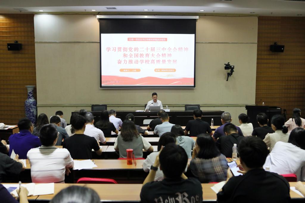 王晓为党员们讲授“学习贯彻党的二十届三中全会精神和全国教育大会精神 奋力推动学校高质量发展”专题党课。他强调,要在全面学习上下功夫,各党支部要提高政治站位,持续推动全会精神学习贯彻热潮,确保覆盖每一个支部、每一位党员;要在全面把握上下功夫,弘扬改革创新精神和教育家精神,注重系统集成,树立全局观念,注重突出重点,精准发力攻克难关;要在全面落实上下功夫,强化党建引领,充分发挥职能部门的统筹协调保障作用,以钉钉子精神抓好落实,为学校高质量发展贡献力量。