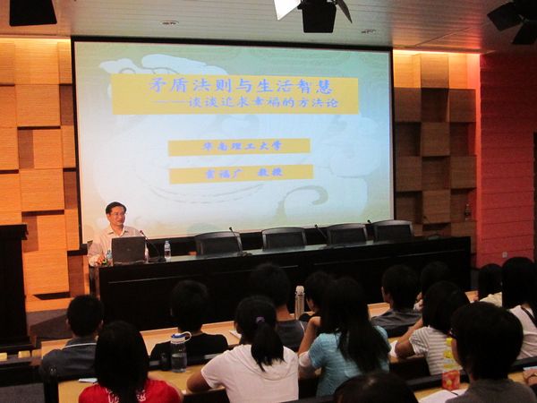 5月18日晚,华南理工大学思想政治学院首席教授、博士研究生导师霍福广在5号学术报告厅为taptap300多位学生做了题为《矛盾法则与生活智慧 —谈谈追求幸福的方法论》的精彩讲座。由此,本学期主题为“身心和谐同‘创文’•感恩生活话幸福”的文化素质大讲堂系列讲座正式拉开了帷幕。