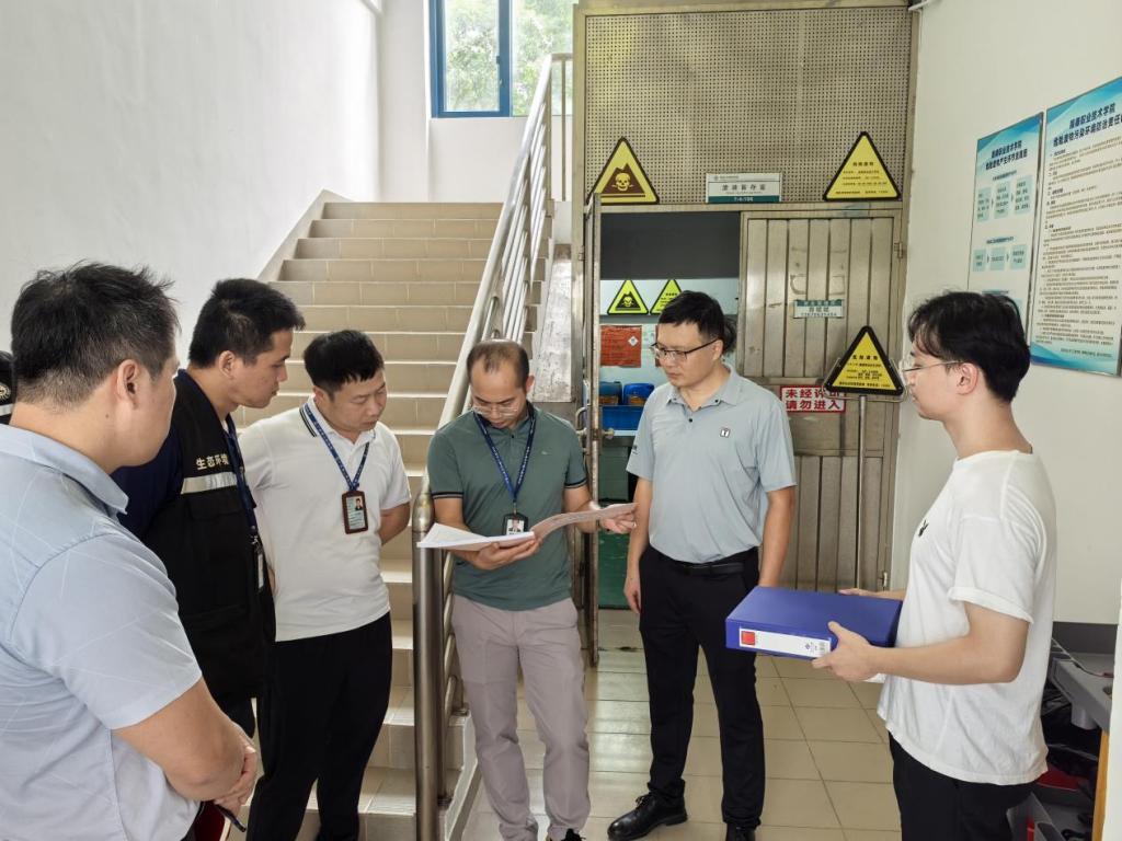 检查组一行重点检查了学院实训楼的危废中转室和暂存室,详细查看了危废管理情况。在检查过程中,检查组对危废的分区存放、检签标识、台账记录以及危废处理合同有效期等方面进行了细致的核查,并给予了高度的评价。