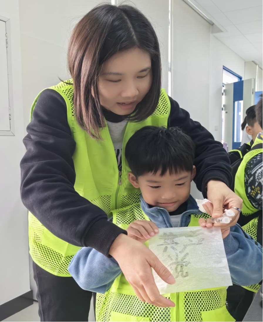 黄翠虹博士带领孩子们玩起有趣的科学小试验——喷墨作画。当看到自己画出来无色的画遇到碘酒瞬间变色,孩子们脸上绽放出灿烂的笑容,在小小试验中领悟大智慧,感受科学的神奇魔力。