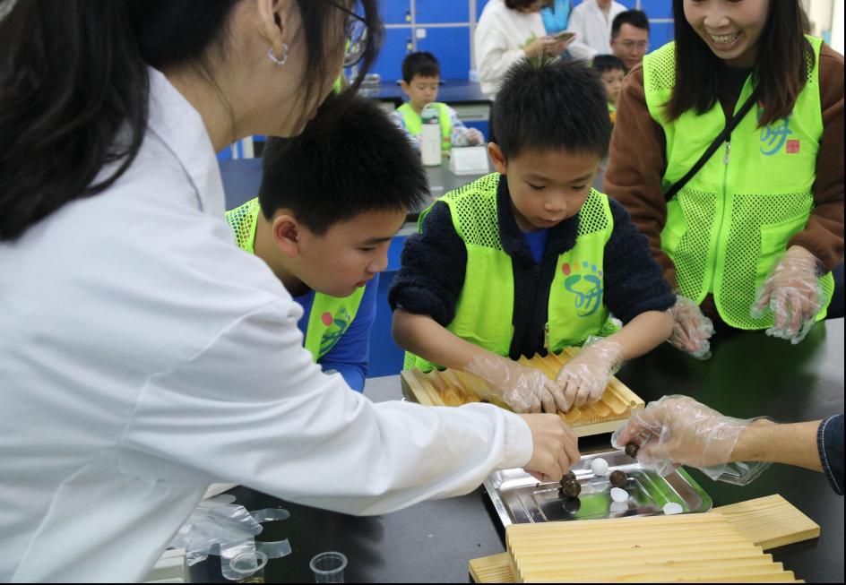 在分子生物学实验室,王秀芬博士带领孩子们认识可爱的实验动物——斑马鱼,一同探索分子生物学的奥秘。“斑马鱼能用来做什么实验?”“斑马鱼也会睡觉吗?”孩子们饶有兴致地围在显微镜前,仔细观察斑马鱼的奇妙微观世界,不时提问,快乐的笑声充满实验室。